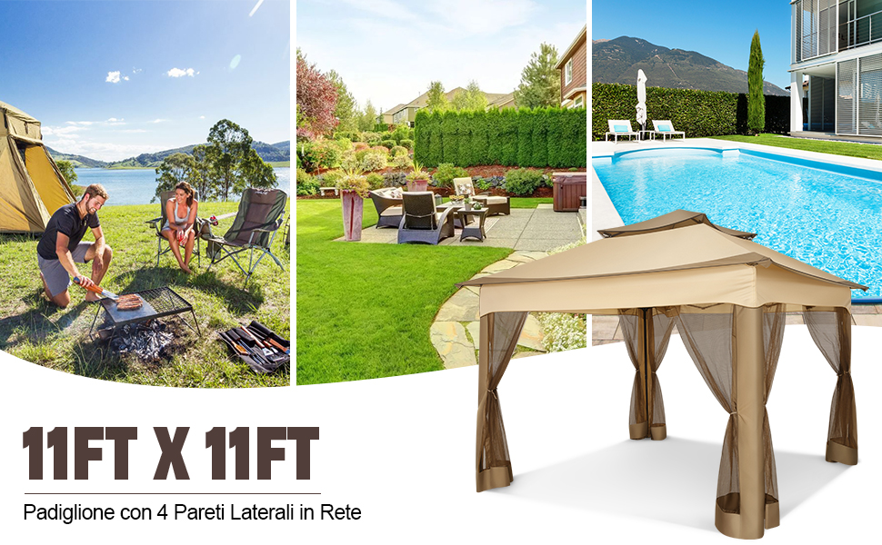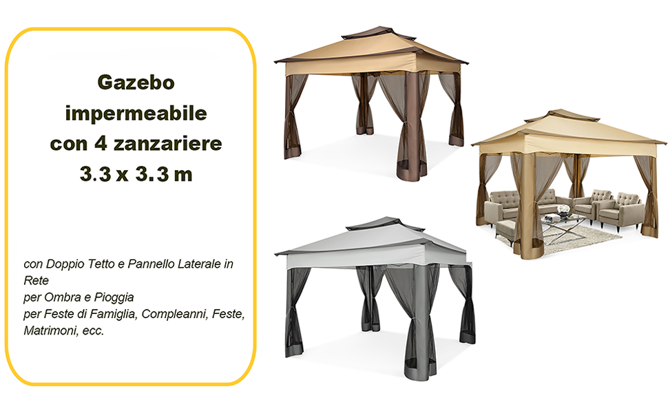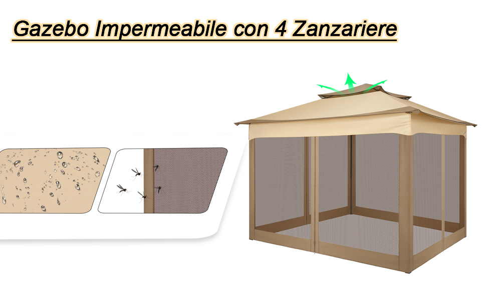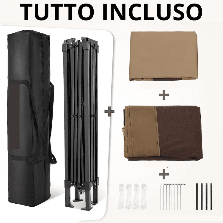 Si monta e si smonta in 3 minuti senza fatica. Largo 3 metri, profondo 3 metri e alto 2,5 metri. ZANZARIERE LATERALI INCLUSE